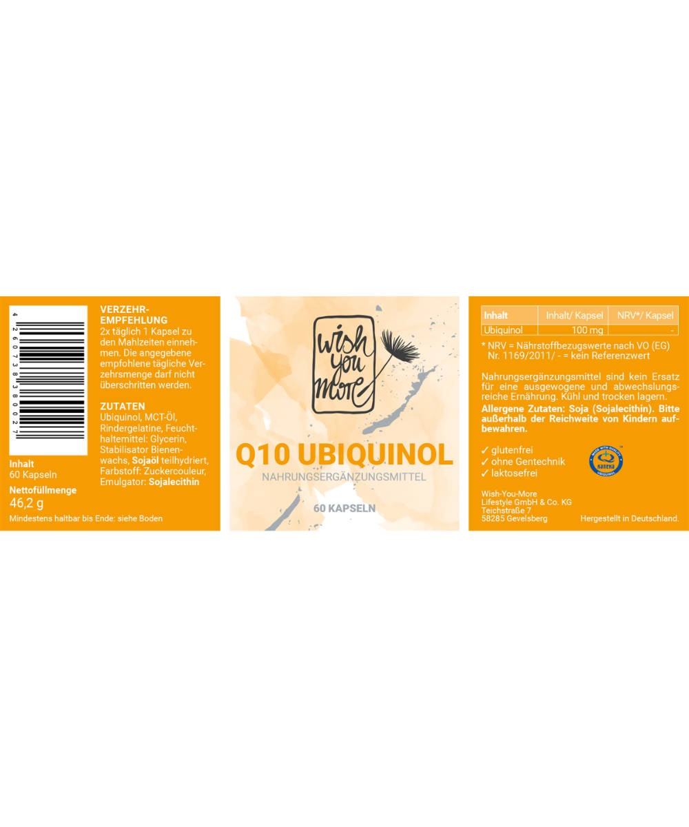 Kaneka Ubiquinol®, MCT-Öl, Sojaöl, Lecithin, Bienenwachs 60 Kapseln. Pro Kapsel 100 mg Ubiquinol®