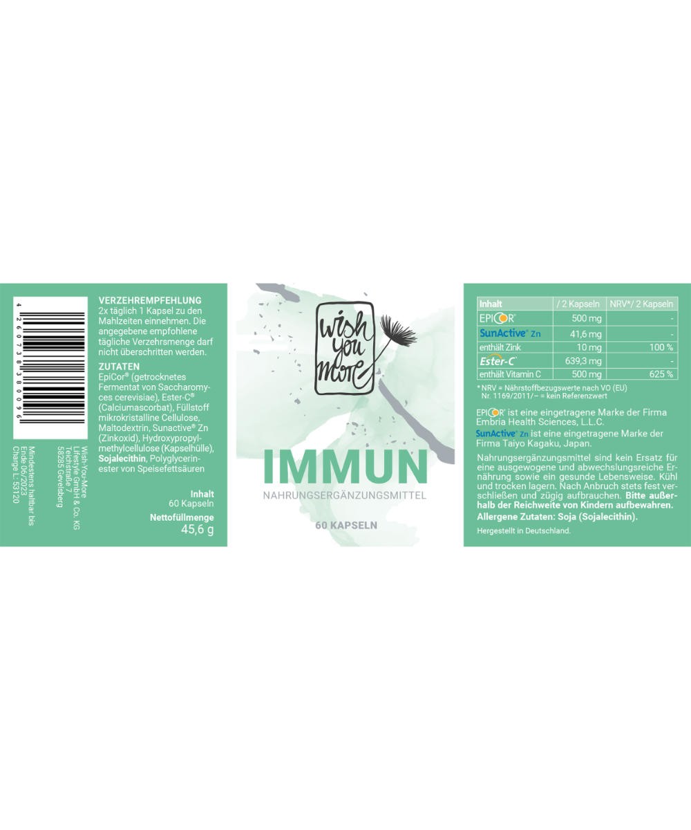 1. Was macht IMMUN so besonders? IMMUN kombiniert drei hochwertige Premiumrohstoffe – Ester-C®, SunActive® Zinc und EpiCor® – in einer einzigartigen Formel. Die Inhaltsstoffe ergänzen sich optimal und bieten eine umfassende Unterstützung für das Immunsystem und das allgemeine Wohlbefinden. 2. Wie unterstützt IMMUN meine Gesundheit? IMMUN begleitet dein Immunsystem auf natürliche Weise – sowohl systemisch im Körper als auch lokal an der Darmschleimhaut. Durch die ausgewogene Kombination von Vitamin C, Zink und EpiCor® wird eine sanfte, gut verträgliche Unterstützung ermöglicht.* 3. Für wen ist IMMUN geeignet? IMMUN ist ideal für alle, die ihre tägliche Versorgung mit Vitamin C und Zink gezielt ergänzen möchten und dabei besonders auf die Unterstützung ihres Immunsystems und die Darmgesundheit achten. 4. Wie nehme ich IMMUN ein? Wir empfehlen die Einnahme von 2 Kapseln täglich, am besten zu den Mahlzeiten mit ausreichend Flüssigkeit. Bitte beachte die empfohlene tägliche Verzehrmenge und kombiniere das Produkt mit einer ausgewogenen, abwechslungsreichen Ernährung und einer gesunden Lebensweise.